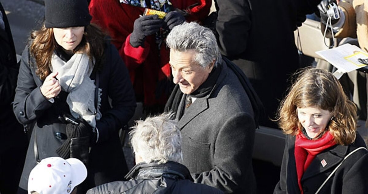 The jumbotrons are now showing the entrance of the luminaries on the stage - possibly Muhammad Ali, a shot of Dustin Hoffman, the descendants of Martin Luther King, Jr., Dustin Hoffman, ambassadors intercut with shots of Dustin Hoffman - who exactly is being inaugurated here? There's John Cusack too - and more Dustin Hoffman.