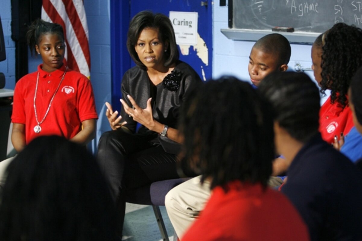 Mrs. Obama鈥檚 visit was part of a Women鈥檚 History Month event, in which the White House invited 21 female luminaries from all over the country 鈥 including Alicia Keys, Mae Jemison, Sheryl Crow, and Dominique Dawes 鈥 and sent them out to visit with students, mostly girls, at schools in DC and the suburbs.
