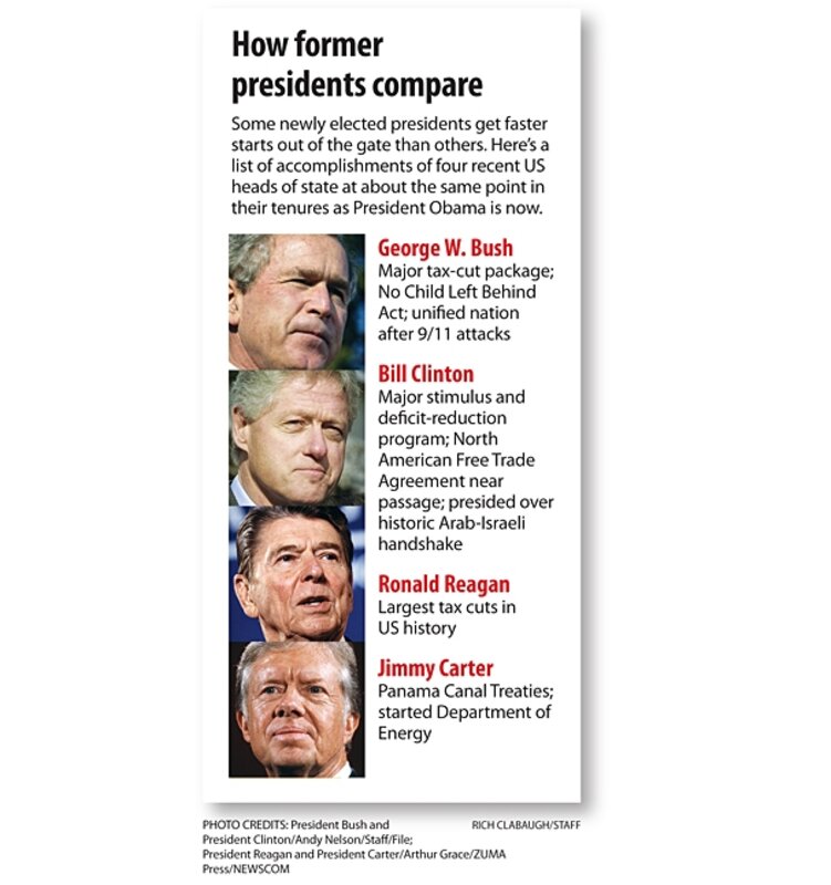 Obama鈥檚 immediate predecessors can all claim some victories in their first nine months in office. George W. Bush cut taxes, passed the No Child Left Behind education reform, and pulled the nation together after 9/11. Bill Clinton passed a major stimulus and deficit-reduction program, was on his way to passing the North American Free Trade Agreement, and presided over a historic Arab-Israeli handshake.