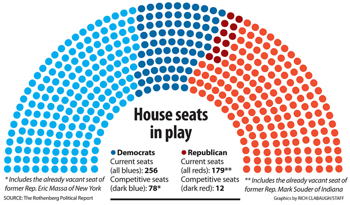 Typically, no more than 35 House seats are in play (chalk that up to the science of redistricting, which produces many districts that all but ensure one party's dominance). This year, 88 seats are seriously in play 鈥 12 Republican and 76 Democratic, according to the Rothenberg Political Report.