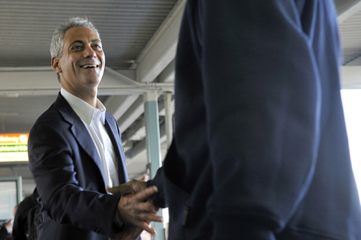 Rahm Emanuel stood on commuter train platforms here during the early morning rush hour Monday to shake hands, pose for pictures and talk with city residents, a preamble to his run to become Chicago鈥檚 mayor.