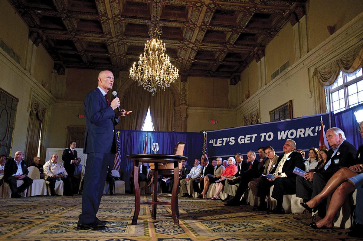 Rick Scott hardly seems the slick, glad-handing politician that voters are used to. He speaks softly, almost mumbling, as he lays out his plan for taxes and insurance at a recent town-hall meeting at the swanky Biltmore Hotel in Coral Gables, Fla. Mr. Scott, a former health-care chief executive, is new to politics. He is very rich and very conservative 鈥 tea party conservative. And he may be the next governor of Florida.
