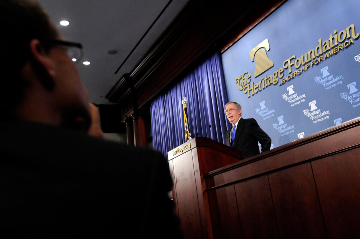 "The fact is, if our primary legislative goals are to repeal and replace the health spending bill; to end the bailouts; cut spending; and shrink the size and scope of government, the only way to do all these things is to put someone in the White House who won't veto any of these things," Senator McConnell said Nov. 4 in an address at the Heritage Foundation in Washington.