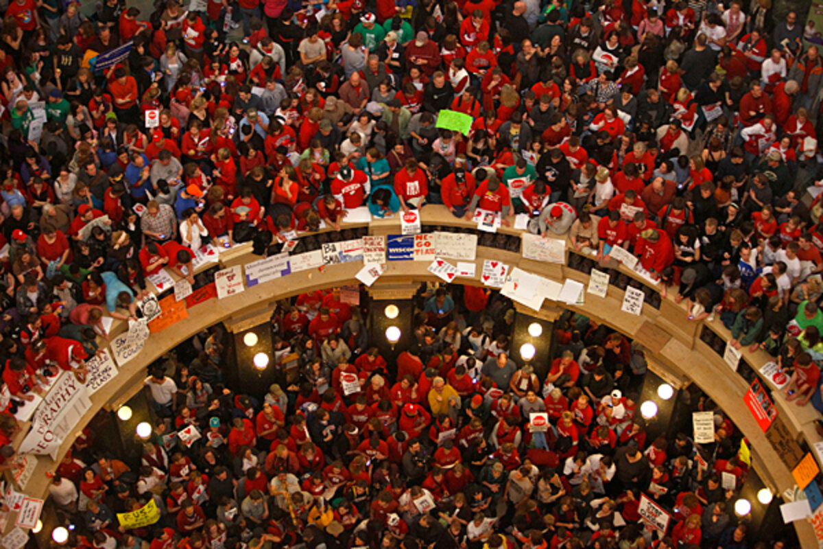 About 40,000 public-sector employees crammed into the Wisconsin state Capitol and surrounding blocks in Madison Thursday, hoping to sway three Republican state senators to block a bill they say is designed to wipe out 50 years of union labor laws in the state.