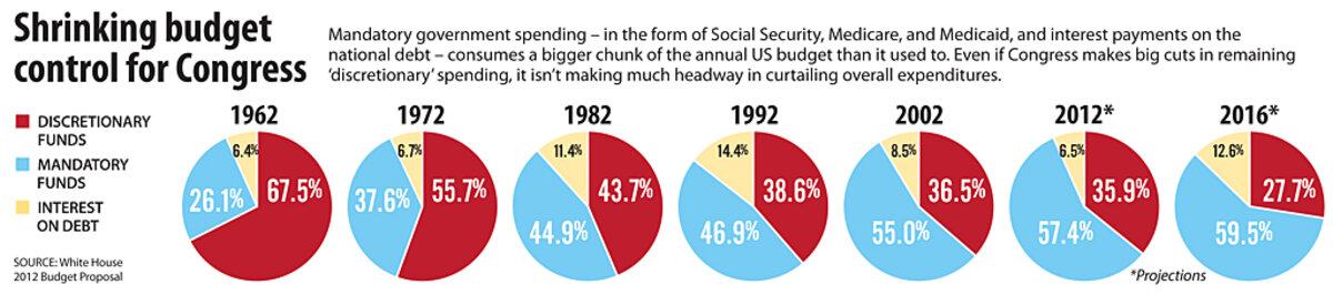 Not so fast. Even if Congress takes a machete to those kinds of government expenditures 鈥 called discretionary spending 鈥 it will barely make a dent in the budget deficit. That's because a growing share of the US budget is dedicated to entitlement programs for retirees and the indigent and to paying interest on the national debt 鈥 none of which is part of Congress's annual budget cycle or easy to reduce.