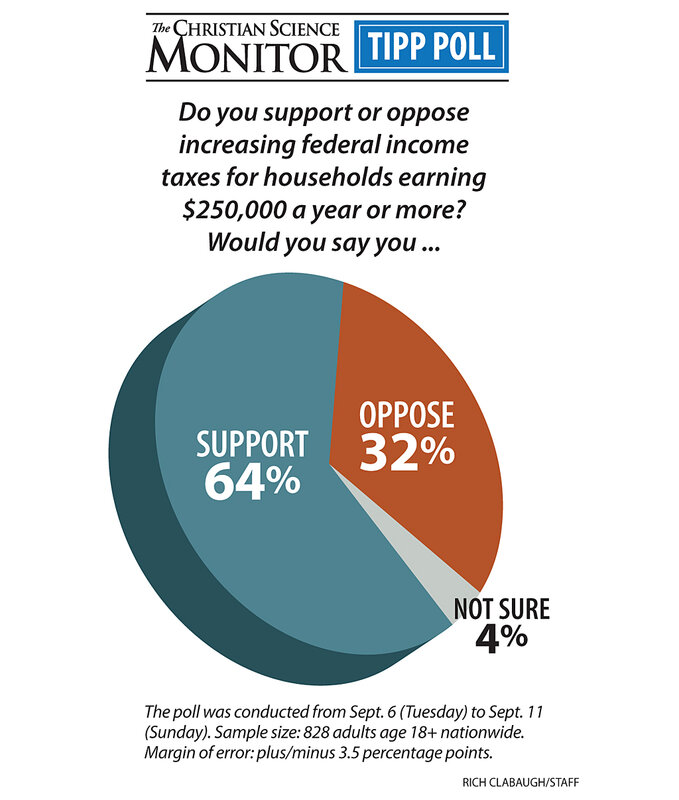 Mr. Reich isn't alone in that belief. More than three-quarters of Americans support progressively increasing federal income taxes for households that earn at least $1 million annually, according to a 海角大神 Science Monitor/TIPP poll taken last month. And 64 percent favor increases for households earning at least $250,000 a year.