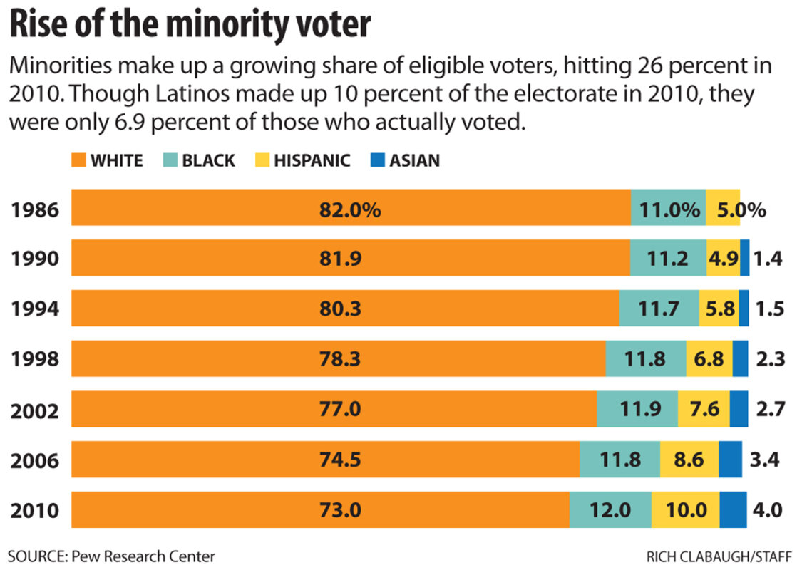The demographics are compelling. The country's minority population grew by 30 percent during the past decade, according to data from the 2010 Census, while the white population grew just 1 percent. In 1992, the minority vote made up 12 percent of the electorate. This year, it's expected to be 28 percent.