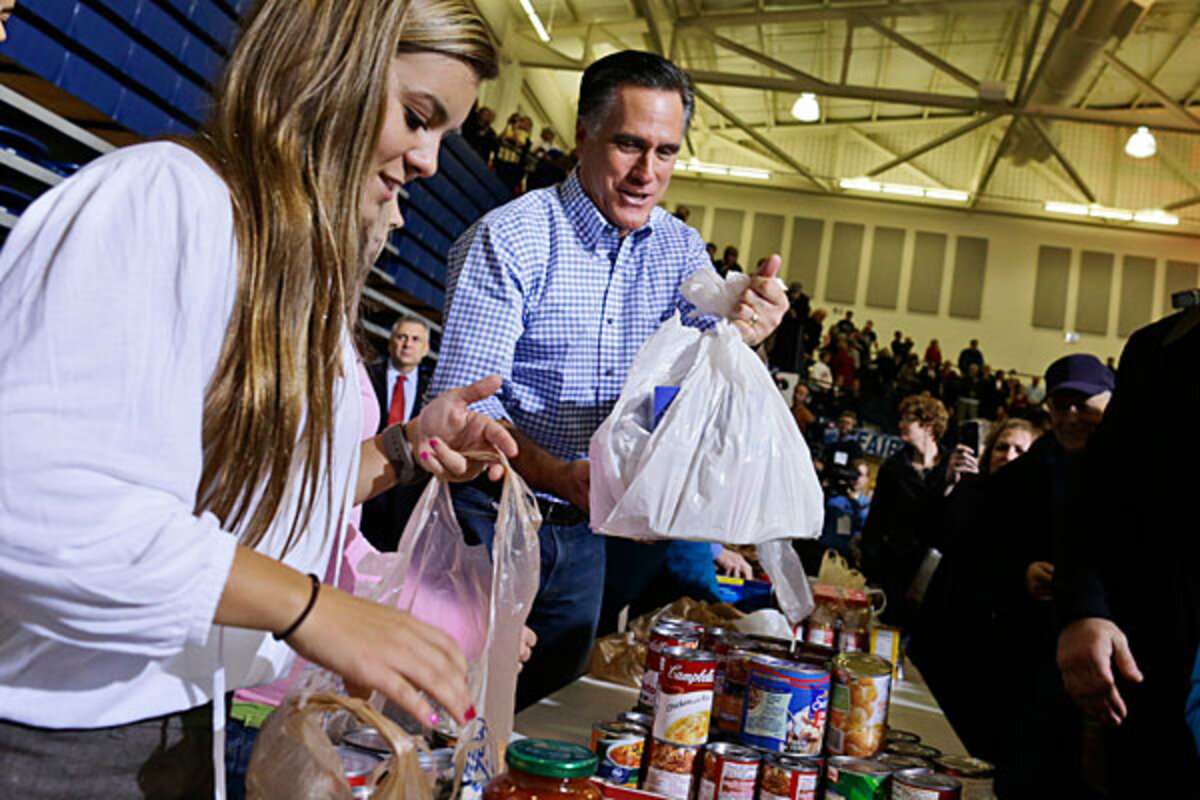 As the party out of power, the Republicans are less constrained, though portraying most of their campaign activities as storm-related. Mitt Romney, running mate Paul Ryan, and Mr. Romney鈥檚 wife, Ann, are all making public appearances Tuesday in battleground states, mostly for 鈥渟torm relief events.鈥 Mr. Romney is in Ohio, the potential tipping-point state on Nov. 6. Ms. Romney is joining 鈥渟torm relief collection efforts鈥 at Romney offices in Wisconsin and Iowa, then appearing at a rally in Des Moines, Iowa, later in the day.