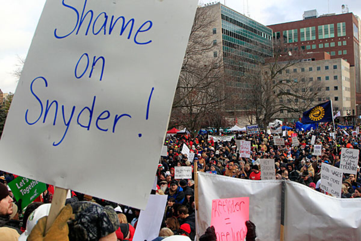 But Michigan lawmakers say unions have no one but themselves to blame. The unions' decision to push for a November referendum to amend the state constitution to protect collective bargaining rights had infuriated the Republicans. When the referendum lost badly, the GOP interpreted that as a green light聽to rush through the legislature two right-to-work bills 鈥 one aimed at public-sector unions and the second at private. The package, which does not apply to police or firefighter unions, was introduced last Thursday, and by Friday both the state House and Senate had voted in favor. A final vote took place Tuesday, and Governor Snyder then signed the package.