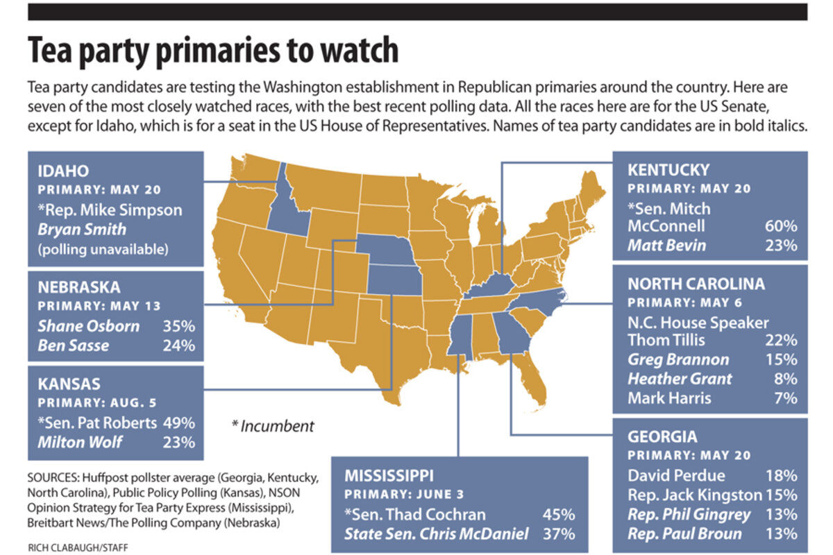 Other tea party challenges to incumbent senators have either already failed (Texas) or are in trouble. Physician Milton Wolf's threat to Sen. Pat Roberts (R) in Kansas suffered a blow in February when he was found to have posted graphic X-ray images to his Facebook page in 2010. Dr. Wolf apologized.