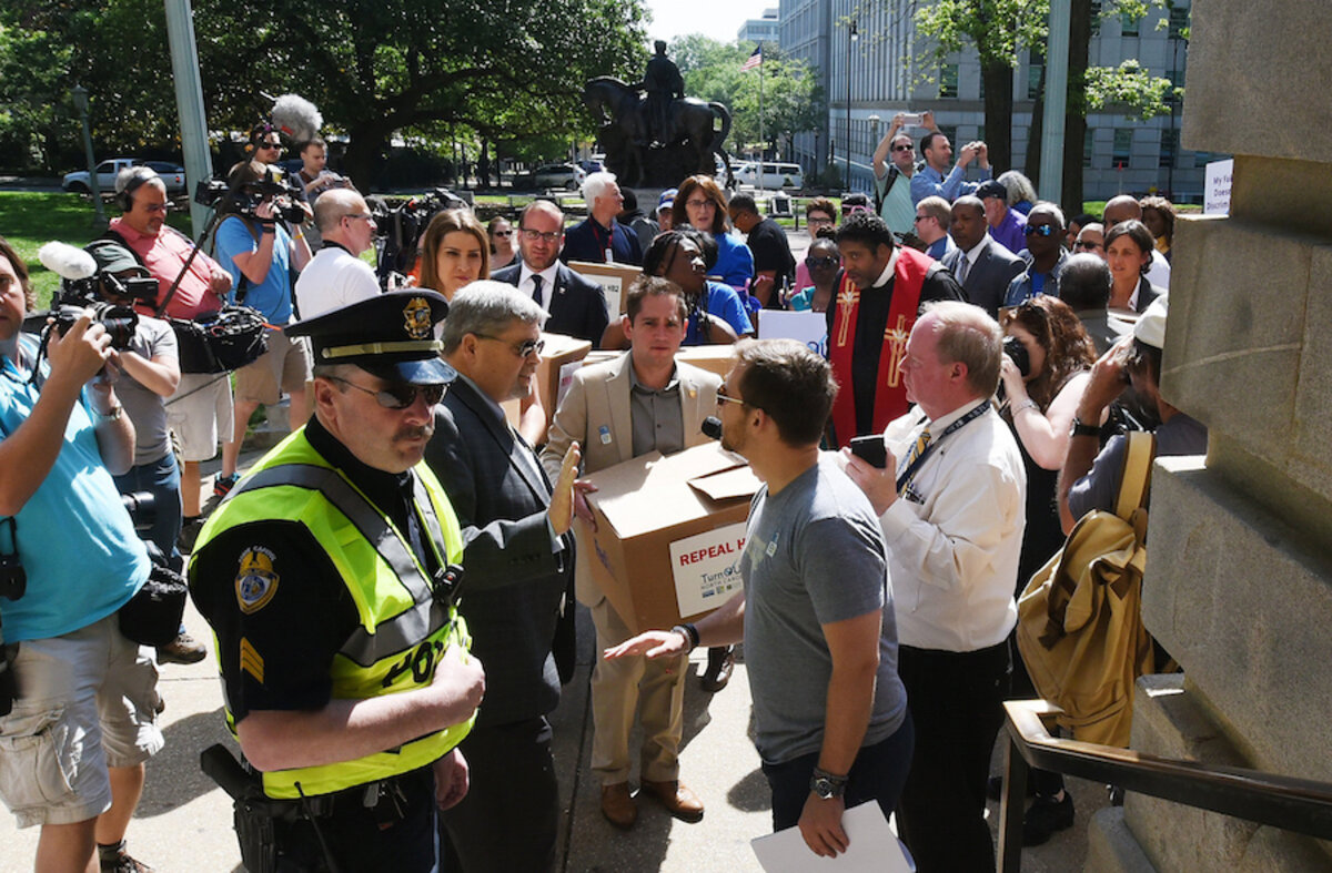Multiple waves of people, a dozen at a time, held a sit-in outside the offices of state legislative leaders, according to the Associated Press.