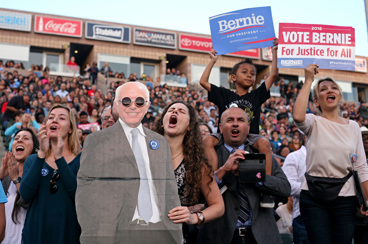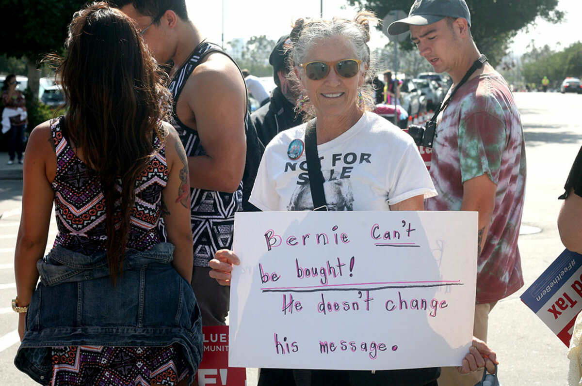 At the rally in Carson, 鈥淏ernie or bust鈥 signs appear amid the placards proclaiming 鈥淪tudents for Bernie,鈥 鈥淟GBT for Bernie,鈥 and 鈥淏ernie is not for sale.鈥