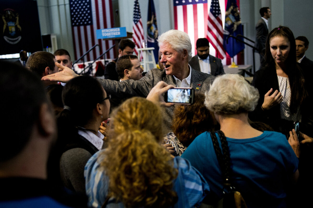 Mr. Clinton at a rally in Flint, Mich., on Monday, speaking about how insurance premiums have risen under the Affordable Care Act.
