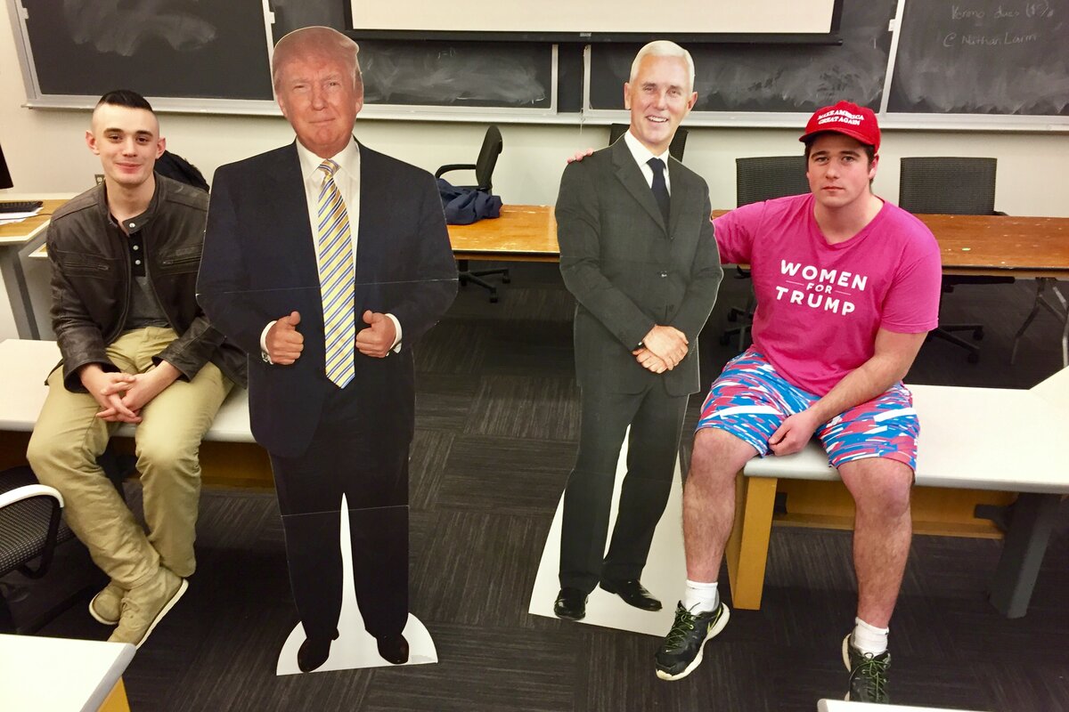 Once inside the safety of a Northeastern University classroom, a handful of students swap winter beanies for the iconic red hats stowed in their backpack: Make America Great Again. One student opens a laptop emblazoned with a "Johnson-Weld 2016" sticker, and another shows off a new camouflaged NRA baseball cap.
