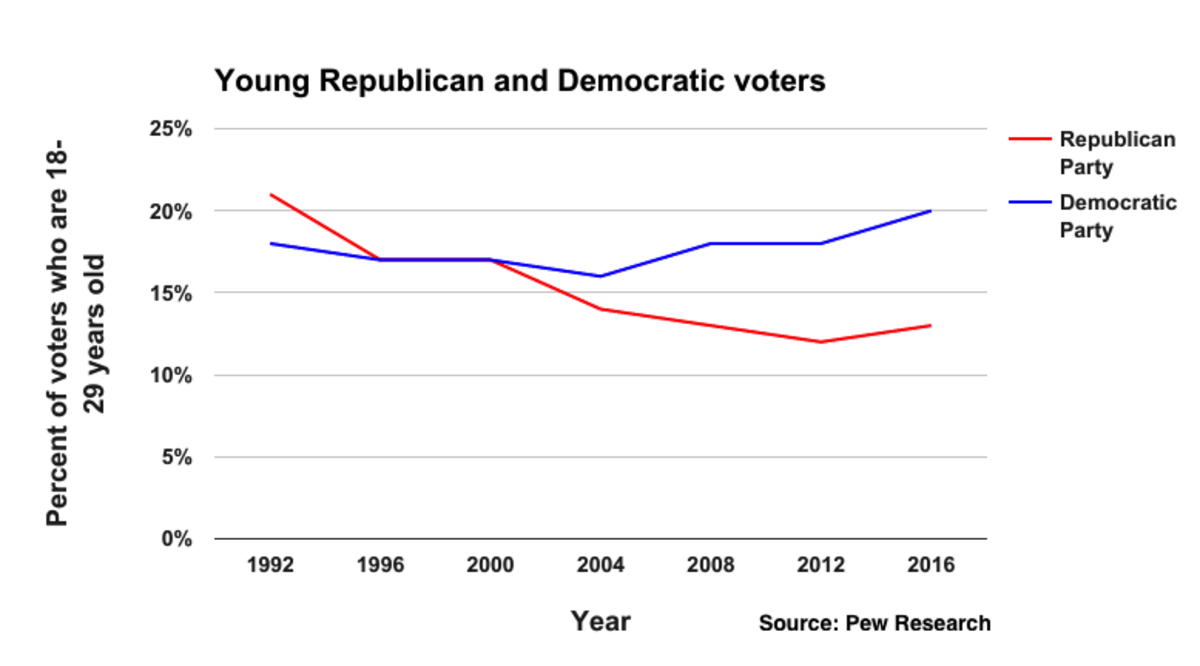According to , 57 percent of Millennials identify as Democratic and 36 percent identify as Republican. Democrats also claim more female and college-educated voters. That can make conservatism a tough sell.