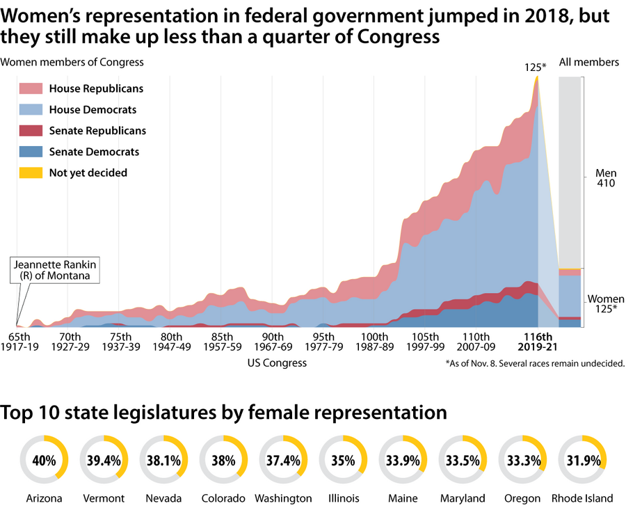 The gains they made this election leave them far short of parity, however. The share of women in the House, for instance, only went up by about 4 points to 23 percent, and most of them took place on the Democratic side. Some of the most high-profile candidates, like Stacey Abrams in Georgia and Kyrsten Sinema in Arizona, appear to have fallen just short of victory (though at press time, neither race has been called).