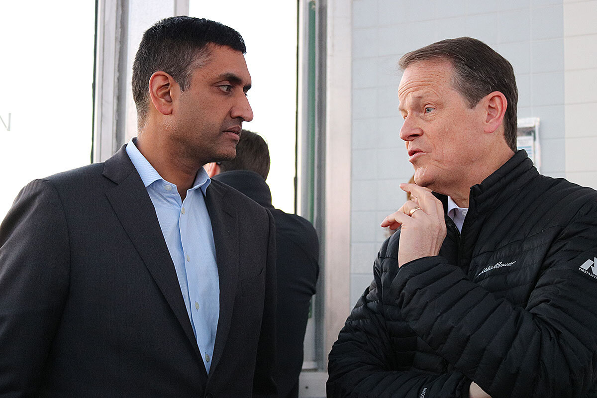 California Rep. Ro Khanna vaults up the stage in one long stride, ignoring the steps that lead up the wooden platform.