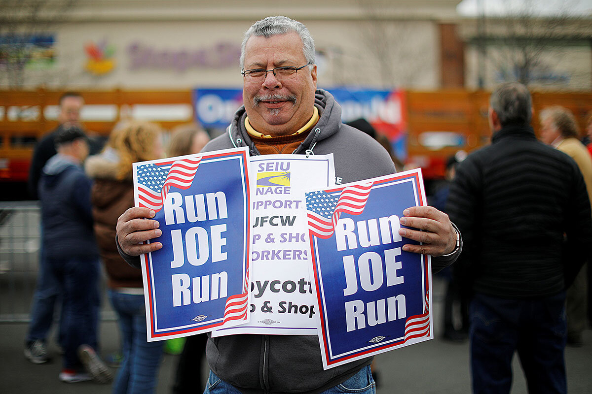 “I don’t think he’s really as of the moment as [Sen. Elizabeth] Warren, Sanders, or the other candidates,” says Jameson Hollis, a college student who came out to see Mr. Biden at a rally with striking Stop & Shop workers last week in the Dorchester neighborhood of Boston.