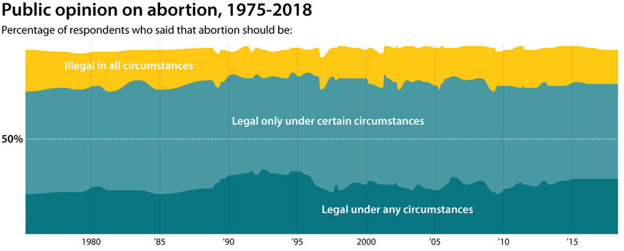 In the U.S., overall attitudes surrounding abortion have remained relatively unchanged over the past 20 years. say that abortion should be legal in all or most cases. What has changed is the partisan divide: today, 76% of Democrats say abortion should be legal in most cases, with only 36% of Republicans in agreement. In 1995, 64% of Democrats favored legal abortion, with 49% of Republicans in agreement.