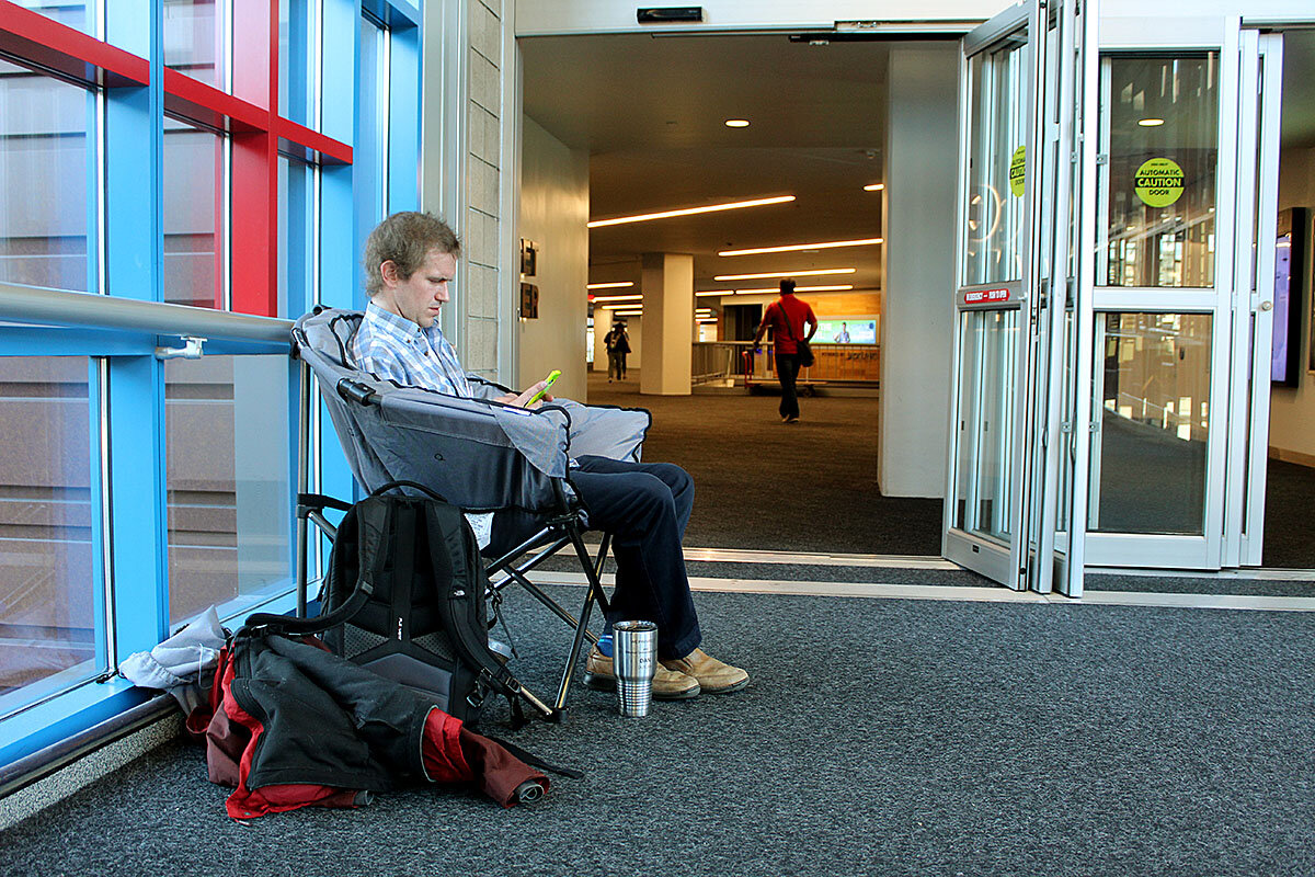 As the collective energy builds, so does the hallway’s temperature. Condensation builds up on the Skyway’s windows and it begins to smell like sweat. To pass the time, fans play card games and watch videos on their phones. Many make their way up to the “Line Starts Here” sign to see who claimed the first spot. Strangers congratulate Mr. Nelson, shaking his hand or giving him high-fives.