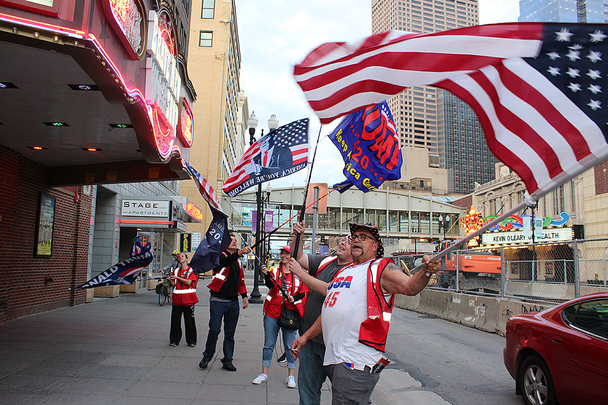 Despite all the talk about feeling ostracized for their political beliefs at home, the “flag drop” is an unapologetic bid for attention. As the MAGA fans march down the sidewalk waving their Trump flags, some drivers and pedestrians cheer in support – but others yell profanities out their windows. Several pedestrians tell the group they are not welcome in Minneapolis; one person throws a Pepsi can at them.
