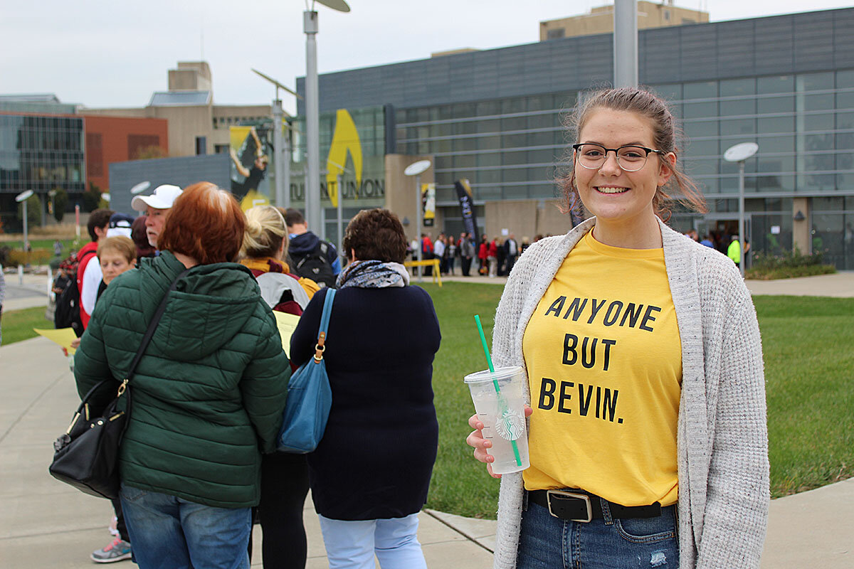 Abby Marsh waits to enter the debate on her Northern Kentucky University campus in a bright yellow T-shirt she made the previous weekend that reads, 鈥淎nyone but Bevin.鈥 A middle grades education pre-major from Georgetown, Kentucky, Ms. Marsh says she has participated in teacher protests against the governor over the past two years. She doesn鈥檛 think Mr. Bevin will be reelected Tuesday.聽