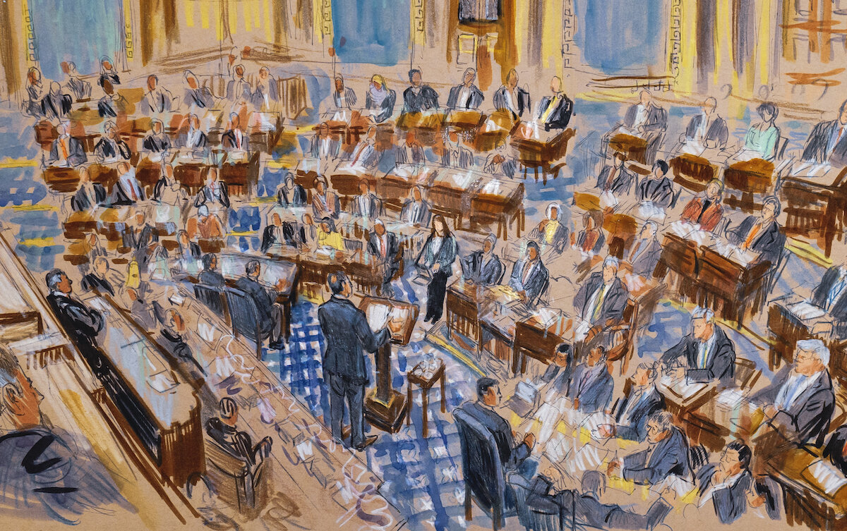 Chief Justice John Roberts gaveled open the session, with House prosecutors on one side, Mr. Trump's team on the other, in the well of the Senate, as senators sat silently at their desks, under oath to do "impartial justice." No cellphones or other electronics were allowed.