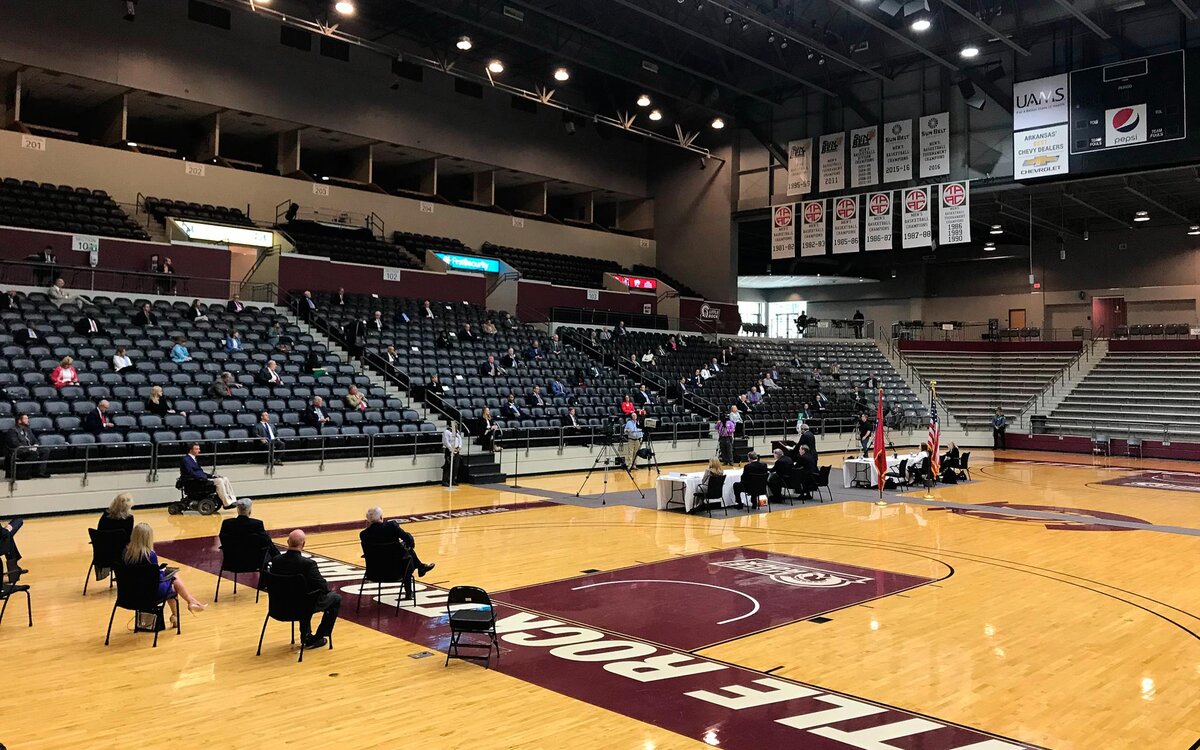 Members of the Arkansas House met in a college basketball arena, spaced out among 5,600 seats, as they voted on ways to cover a budget shortfall caused by the coronavirus punch to the economy.