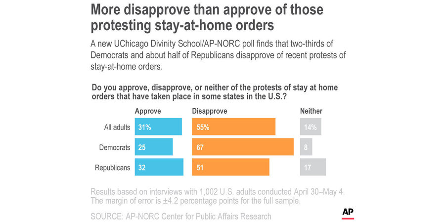 The new survey from the University of Chicago Divinity School and The Associated Press-NORC Center for Public Affairs Research finds 55% of Americans disapprove of the protests that have popped up in some states as some Americans begin chafing at public health measures that have decimated the global economy. Thirty-one percent approve of the demonstrations.
