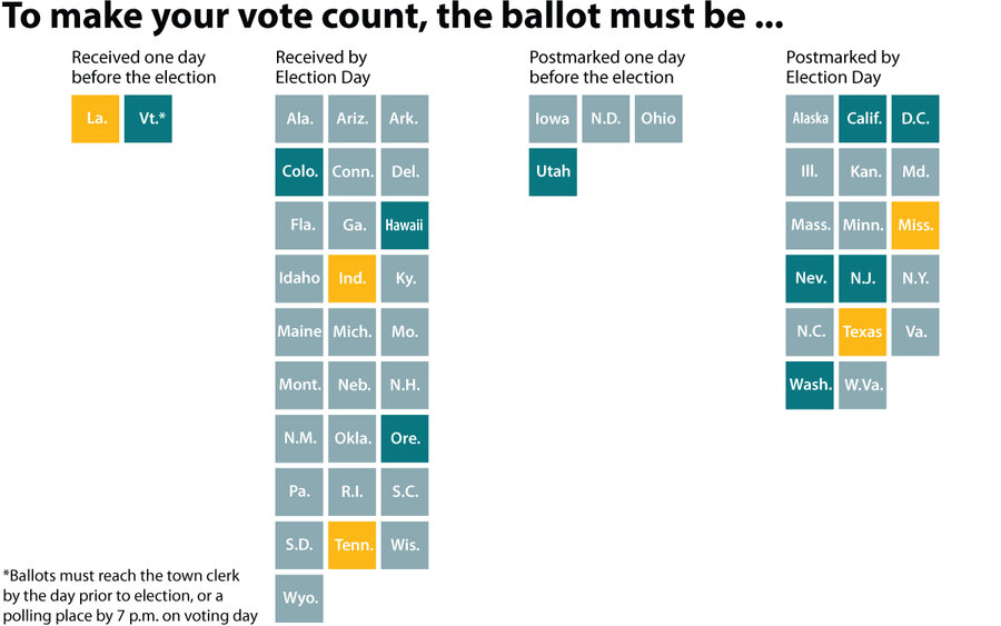 Two states 鈥 Louisiana and Vermont 鈥 require that ballots must be received a day before the election.听