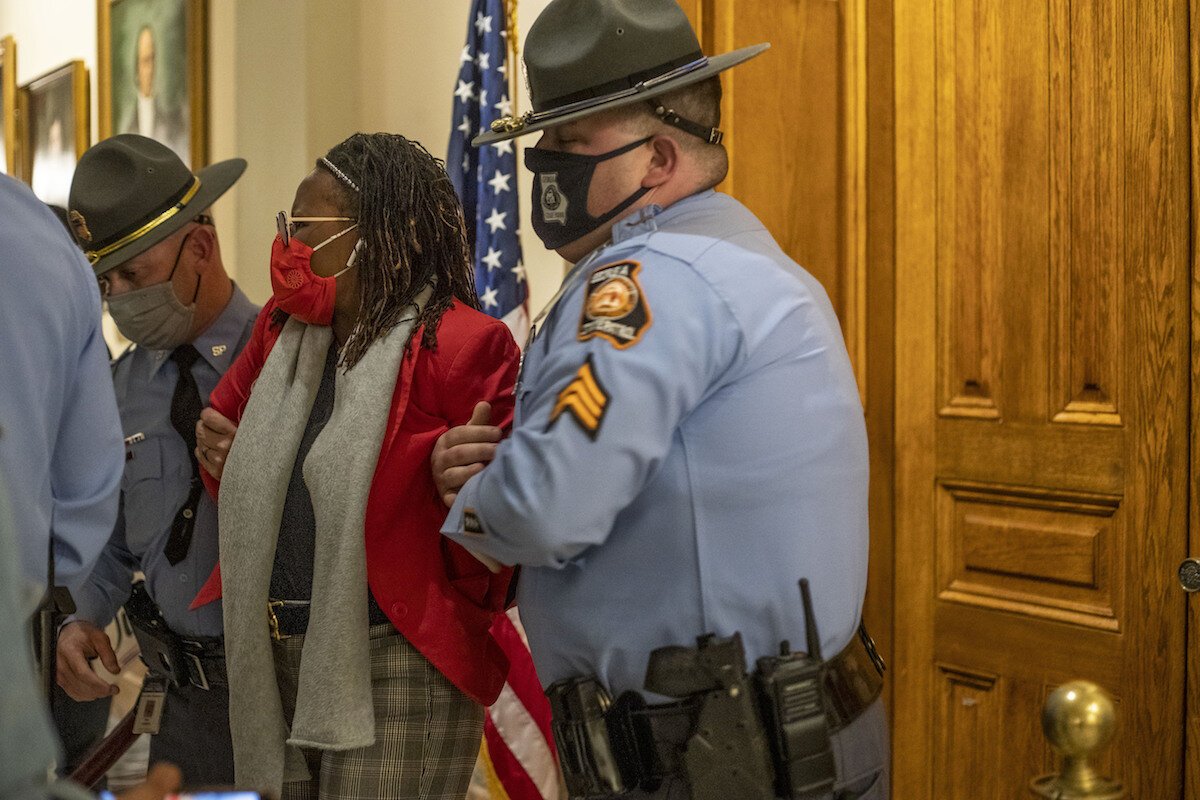 Ms. Cannon was charged with felony obstruction of law enforcement, punishable by one to five years in prison, and with disrupting a session of the General Assembly. She was released late Thursday night.