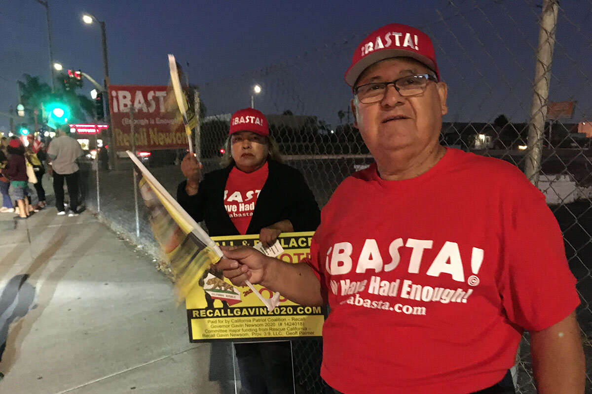 On Tuesday evening, about 18 people rallied with Mr. Flores on this busy corner in the greater Los Angeles area, waving 鈥淩ecall鈥 flags and signs as cars streamed past, some honking approval. The clutch of supporters, several of them Hispanic Republicans like Mr. Flores, aired a long list of grievances: mask and vaccine mandates; schools, businesses, and churches closed by the pandemic; high taxes; unaffordable gasoline; rising crime.
