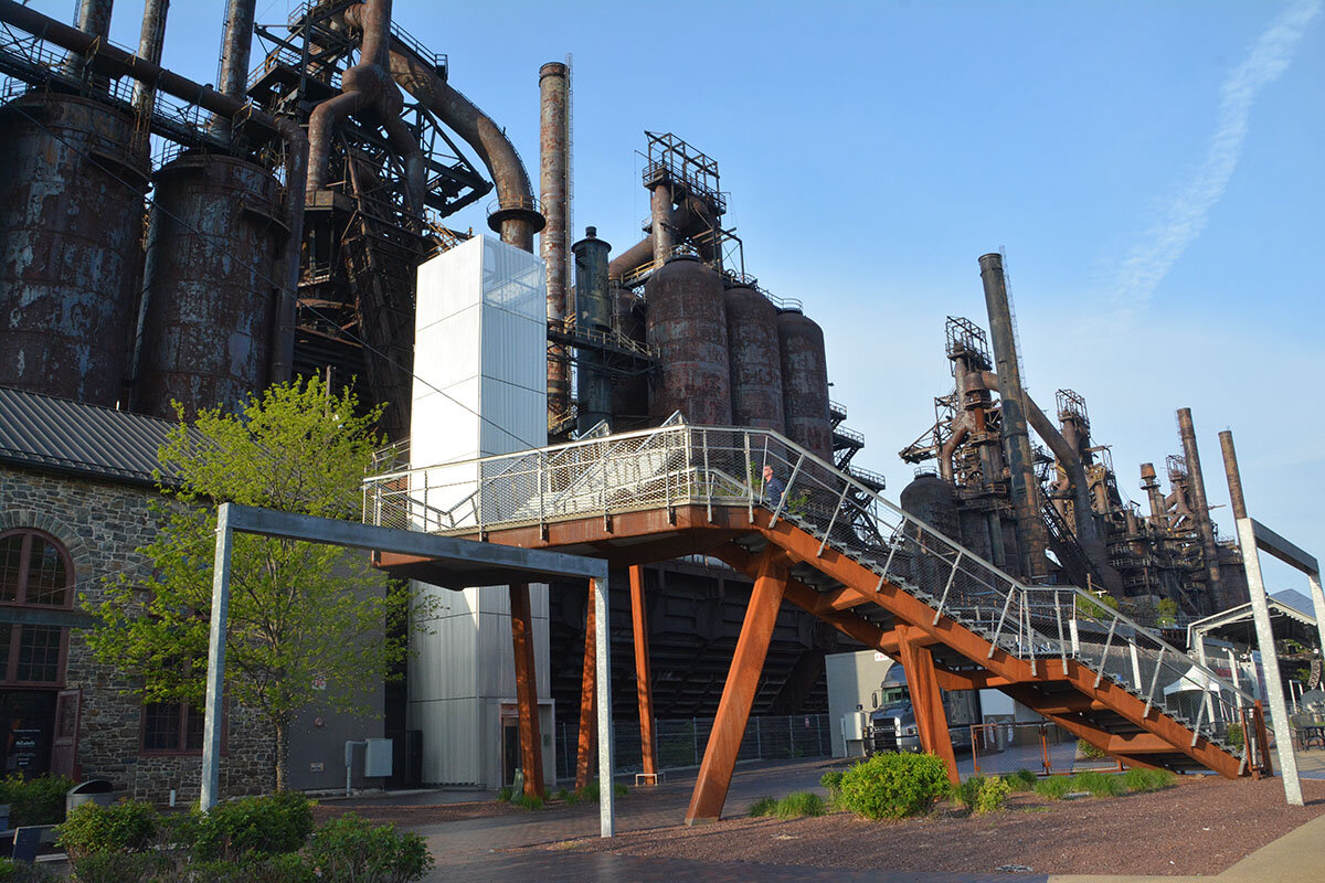 Directly across the Lehigh River from the union hall is the old Bethlehem Steel plant. Founded as the 20th century dawned, Bethlehem Steel was one of the largest steel producing companies in the world, aiding in the construction of major landmarks such as the Golden Gate Bridge in San Francisco and the Empire State Building in New York.