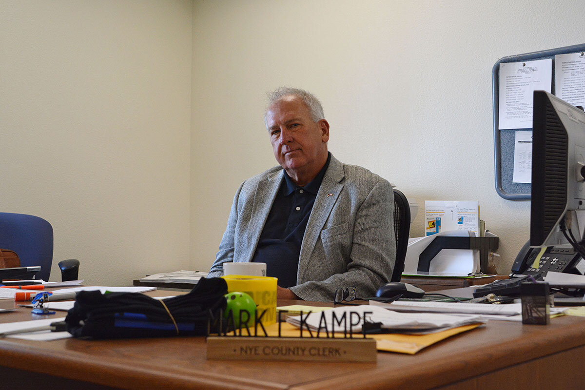 In the waiting room of Mr. Kampf’s office in Pahrump, a sprawling desert town dotted with road signs warning of various animal crossings, copies of the Pahrump Valley Times with the headline “Ballot hand count stopped” are available for $1. A ballot drop box stands in the middle of the room, with two padlocks on the top.