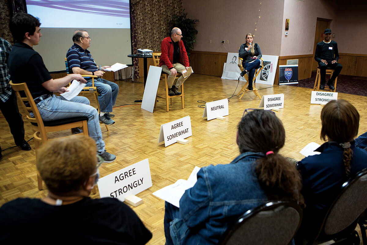 鈥淲e鈥檙e allowed to be passionate here. We鈥檙e not allowed to be offensive here,鈥 says Mr. Wetzel. Back at the church hall, he is warming up for tonight鈥檚 dialogue. He鈥檚 picked a topic 鈥 elections. It is both timely, less than a month from Nov. 8 midterms, and combustible.聽