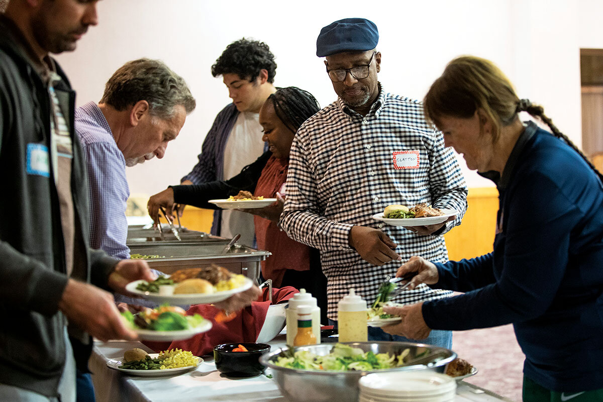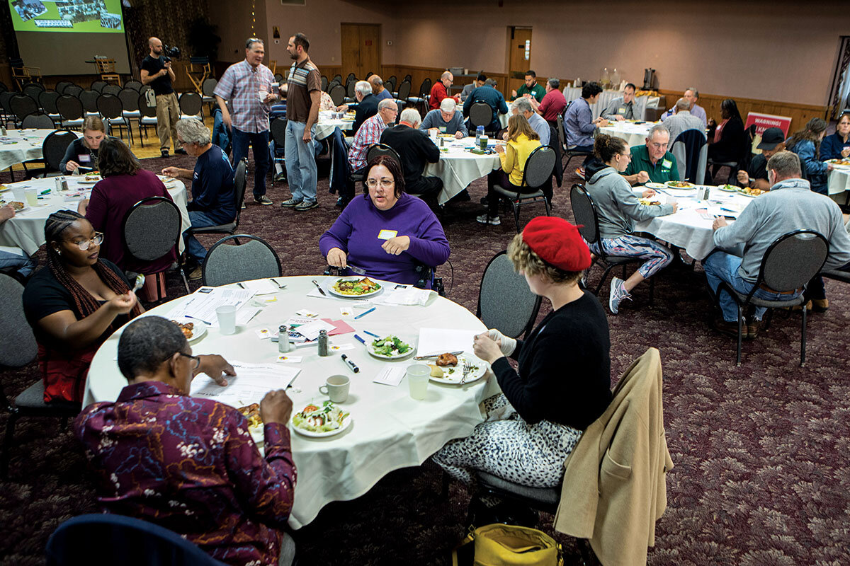 About 50 people, many of them meeting for the first time, have gathered in this Greek Orthodox church hall in a suburb of Akron, Ohio. Over a buffet of chicken, pasta, and tossed salad, they politely get to know one another, five to a table, including this reporter, asking icebreaker questions provided on a sheet of paper. The atmosphere is cordial if a little hesitant.