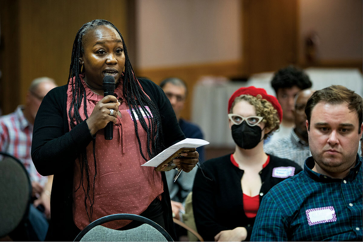 Toward the end, Marsita Ferguson rises from the audience and takes the mic. Ms. Ferguson works at a university in Cleveland and has brought several students to the dinner. She asks why nobody has talked about a history of denying the vote to Black Americans and women, why nobody is talking about a new wave of voter suppression in states like Georgia. 鈥淚 strongly disagree that the will of the people is reflected in anything in this country when it comes to government,鈥 she says.