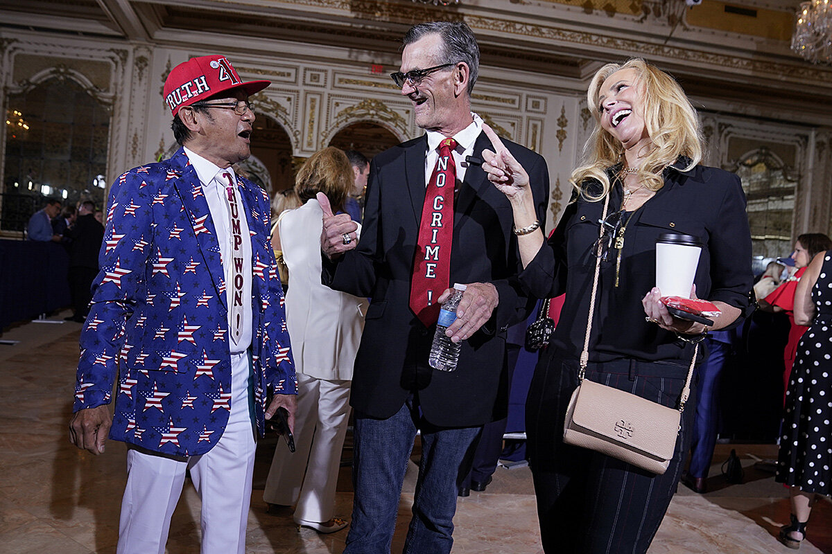 All the familiar trappings were there: The gilded ballroom at Mar-a-Lago. The walk-on music. The coterie, from “My Pillow guy” Mike Lindell to Georgia Rep. Marjorie Taylor Greene to Donald Trump Jr.