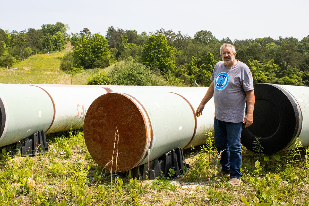 “I’m using their own money to fight them,” he says with a chuckle, walking around the hulking pipes that have been lying in his field for years, waiting to be put in the ground.