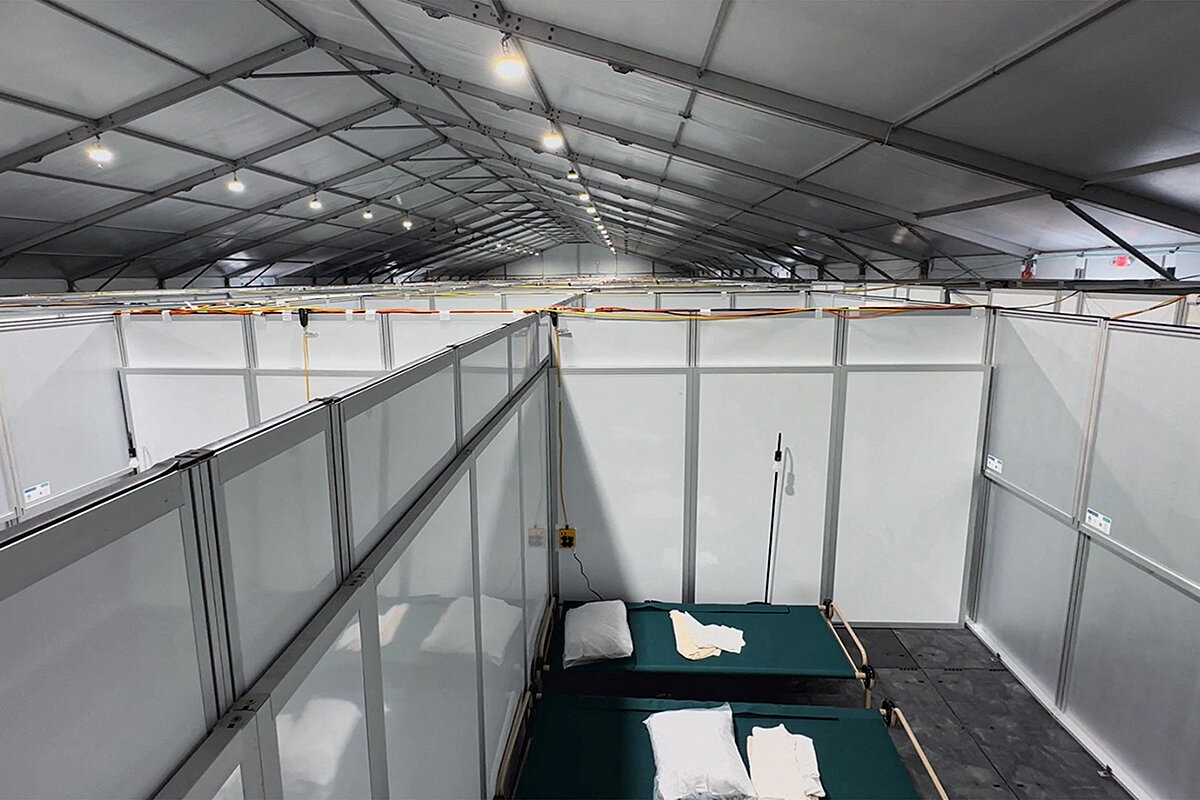 New York City Mayor Eric Adams strides alongside a chain-link fence in front of a shelter tent for migrant families, erected at a former naval air base in Brooklyn. In a video posted by his office, he notes that each tent holds 500 people.