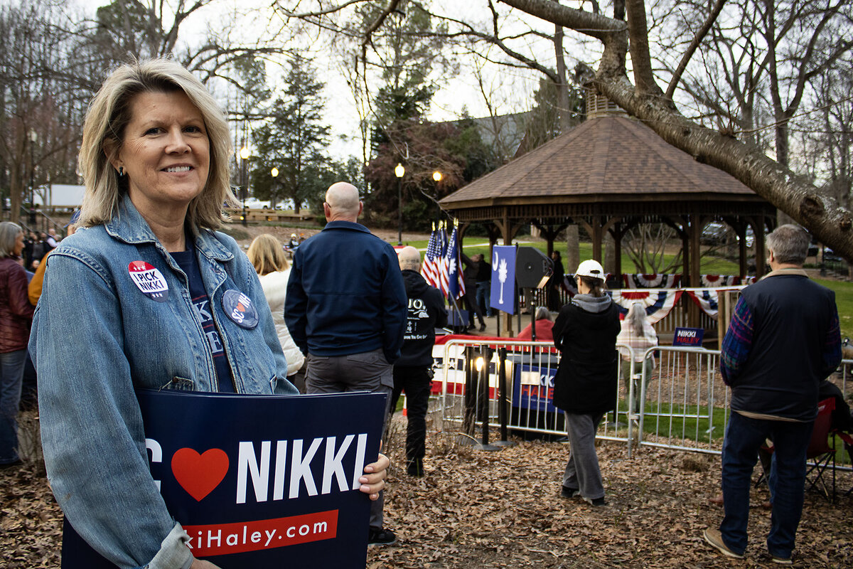 鈥淚 don鈥檛 know that anyone thinks she鈥檚 going to win the state,鈥 says Bev Denny, a campaign volunteer wearing various NIKKI stickers and pins, as she waits to see Ms. Haley speak in a park in Irmo. 鈥淸But] she doesn鈥檛 have to win our state to continue running.鈥