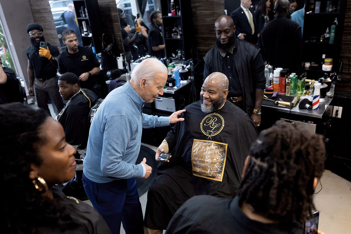 The space is cramped, but President Biden works the room like a pro. Customers and stylists alike stop everything to greet the surprise guest, here to campaign ahead of the state鈥檚 Democratic primary. A member of the Secret Service instructs a barber to put down his razor; after all, he鈥檚 cheek by jowl with the leader of the free world.