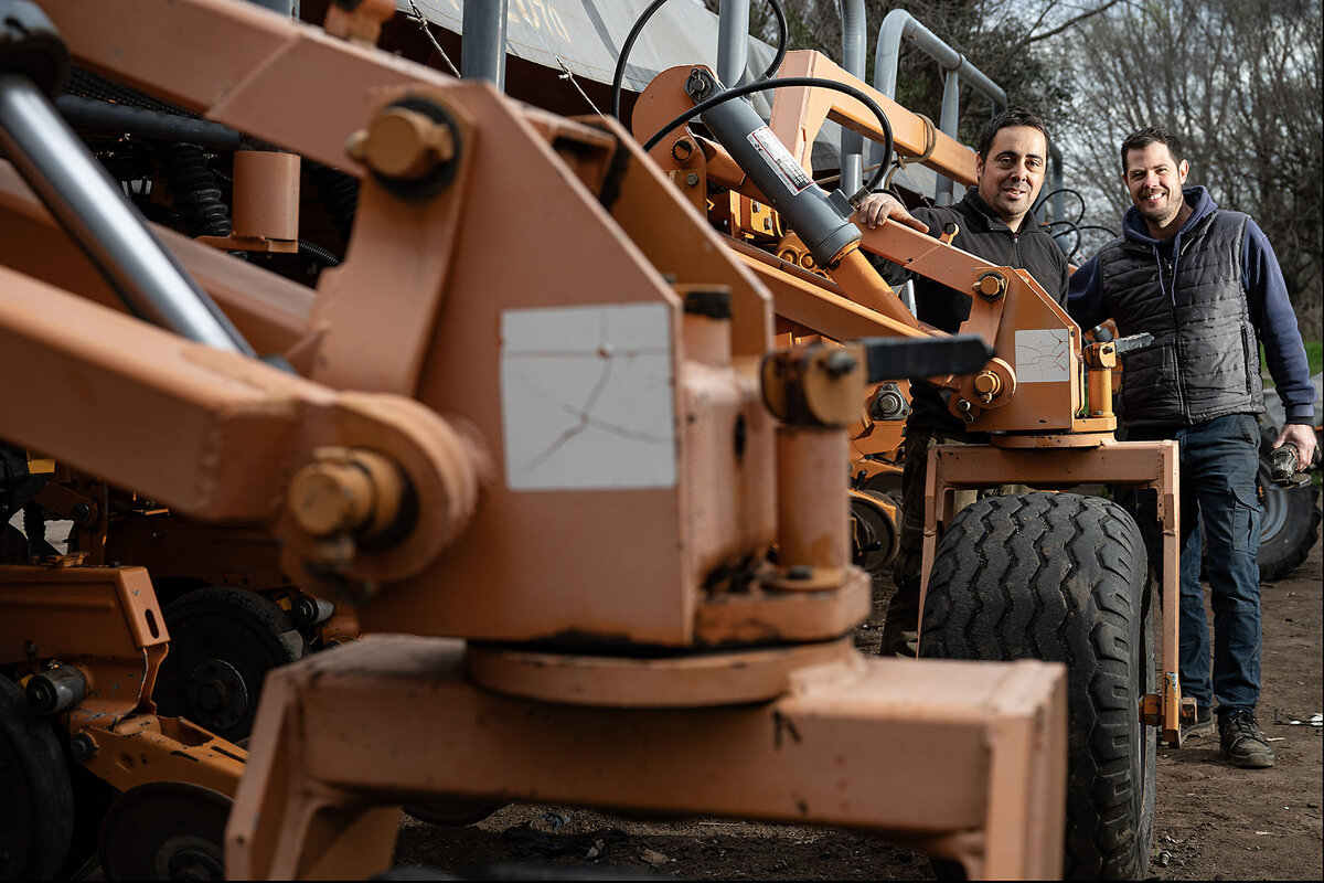 Two cousins, Maximiliano Folco and Juan Ignacio Folco, are chattering about Mr. Milei as they give a seed-sowing tractor a tuneup. The planting season is approaching.