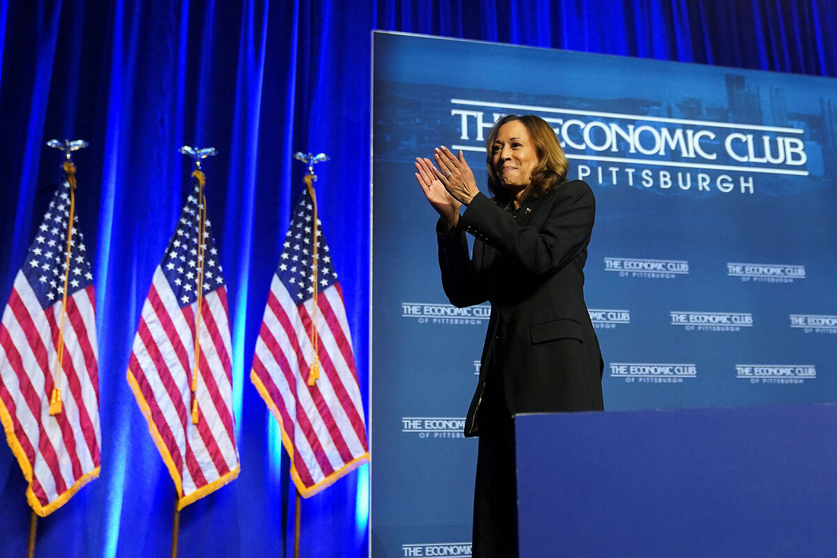 Vice President Kamala Harris applauds as she departs a campaign event in Pittsburgh. With the economy topping the list of voter concerns, Ms. Harris pledges to keep low tax rates in place for all but the highest-income Americans.