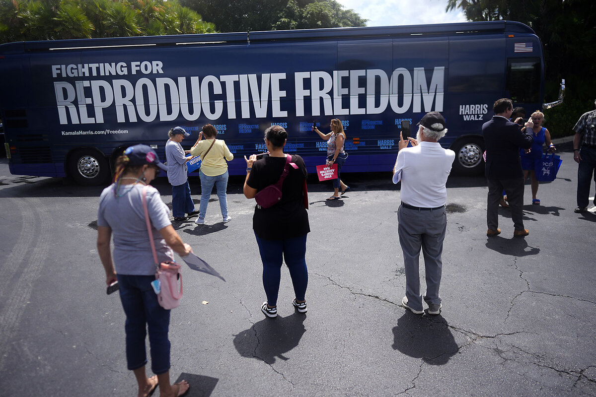 People take pictures of the bus at the start of the "Reproductive Freedom Bus Tour" by the Kamala Harris campaign, in Boynton Beach, Florida, Sept. 3, 2024.