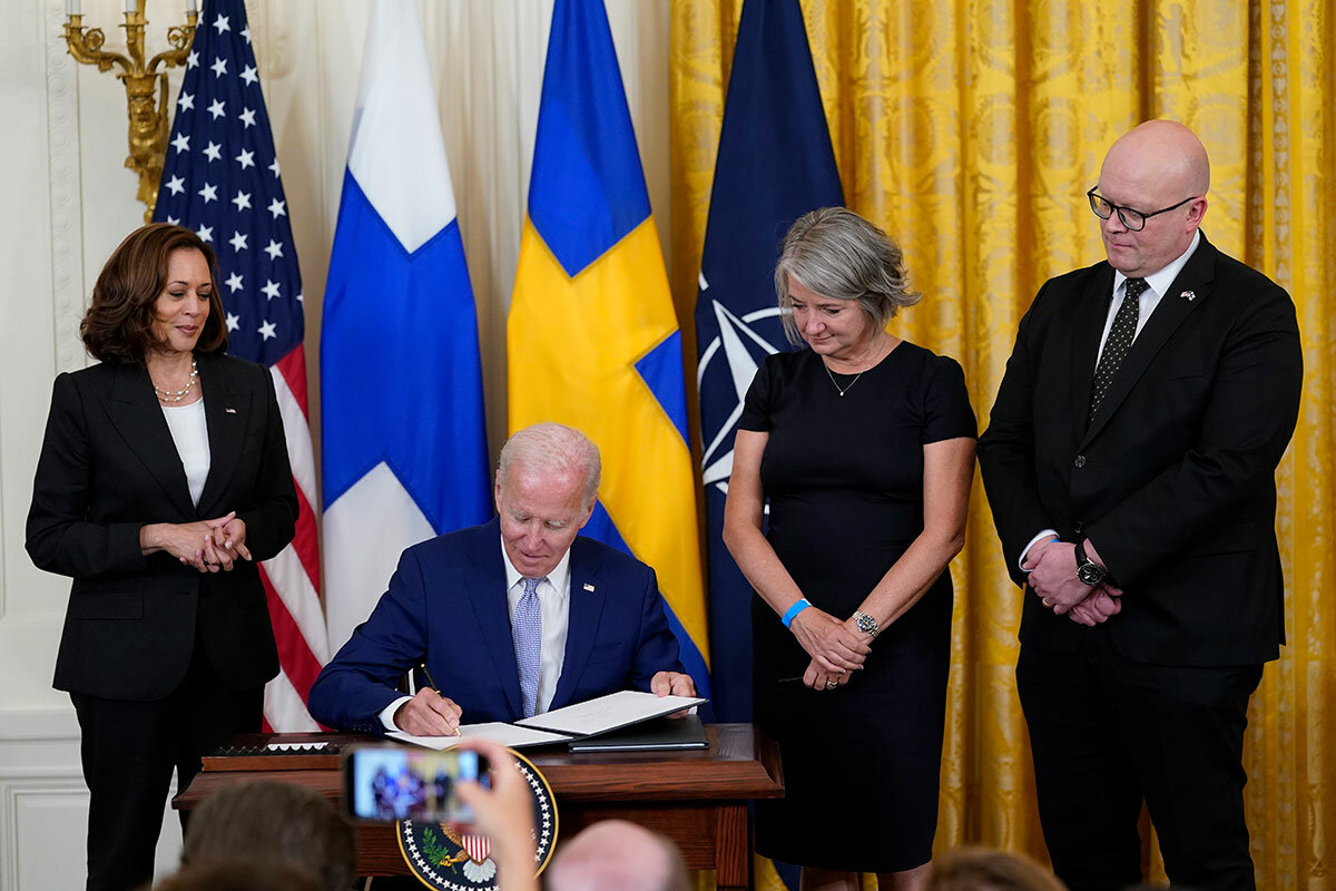 Vice President Kamala Harris watches President Joe Biden sign the treaty admitting Finland to NATO. International alliances would likely be central to her presidential foreign policy.