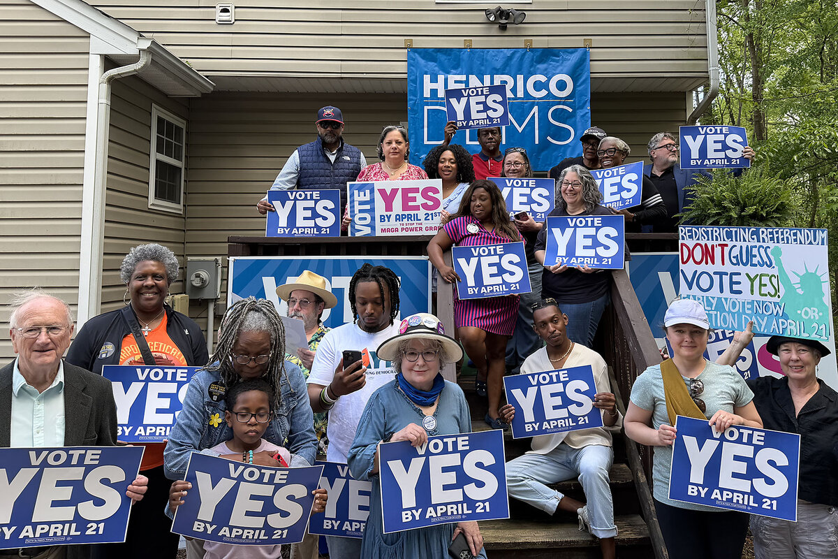 The governor has “made it clear” where she stands, says Democratic U.S. Rep. Jennifer McClellan, whose district includes Richmond. She spoke to the Monitor at a Henrico County rally for the redistricting effort, where roughly two dozen local Democrats gathered to hear Ms. McClellan and state legislators speak next to a poster with Ms. Spanberger’s photo. “I think we’ve gotten what we need from her, and this is an all-hands-on-deck moment. It can’t just be up to her.”