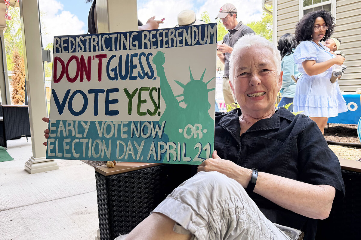 Camille Harris, who brought a hand-painted “Don’t Guess, Vote Yes!” poster, advised her fellow Democrats to steer the conversation back to what President Trump is doing at the national level and remind voters that it was Republicans who started the redistricting wars. But Ms. Harris admits she had to “think about it hard” herself, after campaigning for the state’s independent redistricting commission in 2020.