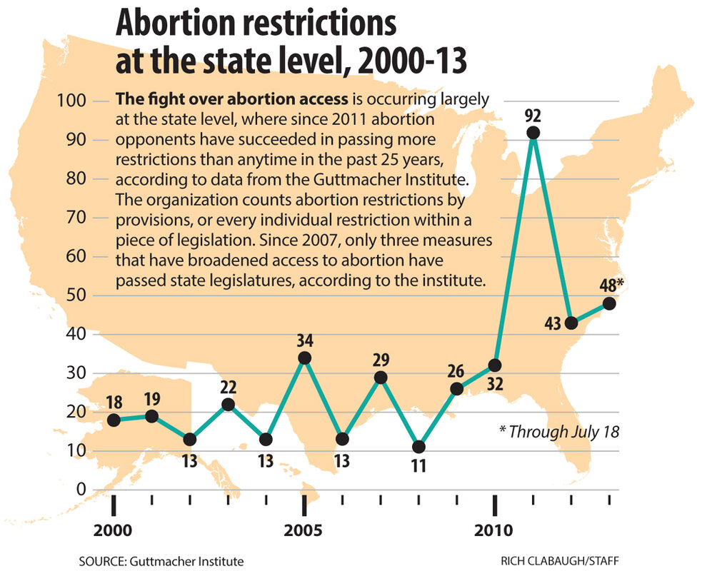 If 2011 saw a peak in the passage of post-Roe abortion restrictions at the state level 鈥 92 鈥 then 2013 is poised to come in second.聽As of July 30, the number of new restrictions is at 55, past the total of 43 for all of 2012, according to the聽pro-abortion-rights Guttmacher Institute, which researches reproductive health matters.
