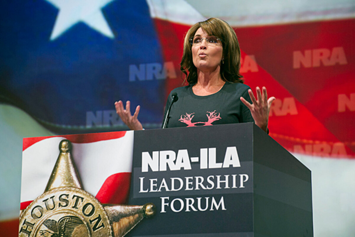 Now, earlier in the speech, Palin criticized President Obama for using parents from Newtown, Conn., as symbols in his attempt to get a gun-control bill through the Senate.